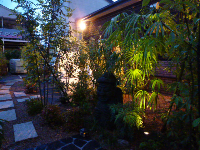 ライトアップし月明かりとともに緑を照らすテラスのあるお庭変更施工例 大野城市南ヶ丘 桃花園